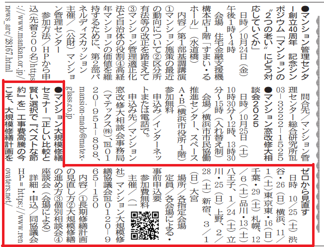この度、NPO日本住宅管理組合協議会様が発行する広報紙「集合住宅管理新聞『アメニティ』(2025年10月5日号)/発行部数10万部」にて、当協議会が主催する「2025(秋)マンション大規模修繕セミナー」をご紹介いただきました。